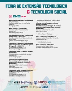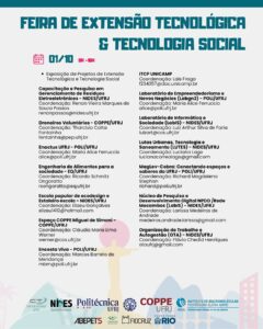 A Feira de Extensão Tecnológica e Tecnologia Social, integrada ao Encontro de Tecnologia Social do Sudeste, será realizada no hall do bloco A do Centro de Tecnologia, durante todos os dias do ETS – Sudeste.