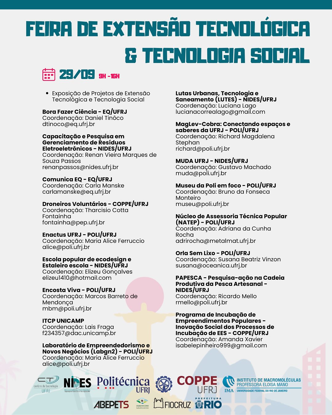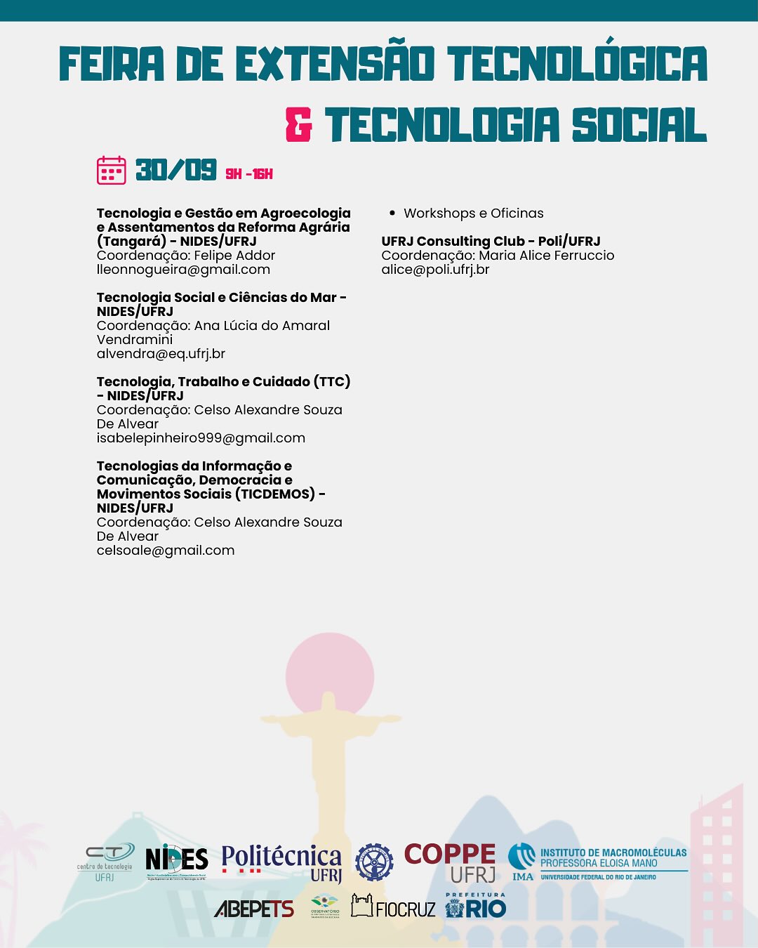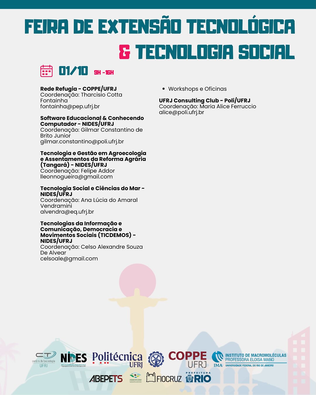 A Feira de Extensão Tecnológica e Tecnologia Social, integrada ao Encontro de Tecnologia Social do Sudeste, será realizada no hall do bloco A do Centro de Tecnologia, durante todos os dias do ETS – Sudeste.