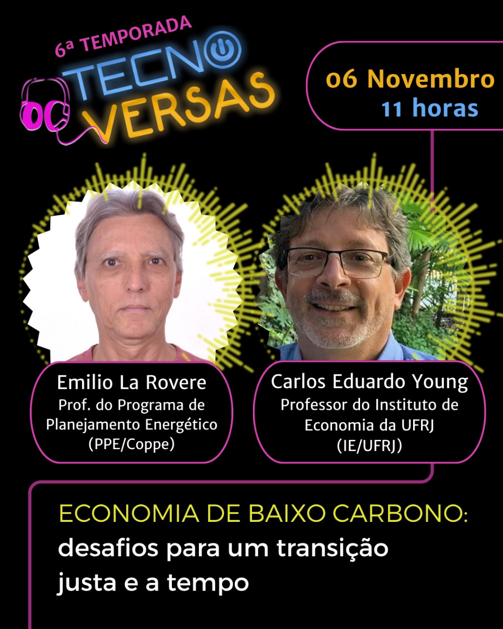 Nesta quinta-feira (6/11), o Tecnoversas vai receber Emilio La Rovere, professor do Programa de Planejamento Energético e Ambiental da Coppe/UFRJ e coordenador do Centro de Estudo Integrado sobre Meio Ambiente e Mudanças Climáticas (Centro Clima da UFRJ) e Carlos Eduardo Young, professor do Instituto de Economia da UFRJ e coordenador do Grupo de Economia do Meio Ambiente e Desenvolvimento Sustentável para falar sobre a transição para uma economia de baixo carbono.