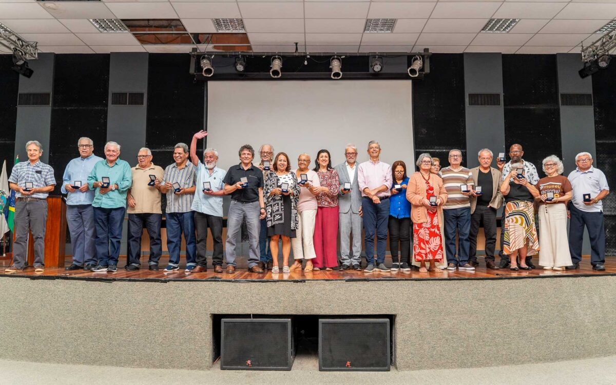 A Universidade Federal do Rio de Janeiro (UFRJ) concedeu medalhas, nesta segunda-feira, 3/11, a 18 docentes e técnicos-administrativos em educação com mais de 50 anos de trabalho na instituição. A cerimônia foi marcada pela emoção dos agraciados e de seus familiares, que lotaram o auditório do Quinhentão, no Centro de Ciências da Saúde (CCS). A atividade integrou a programação da Semana do Servidor 2025.