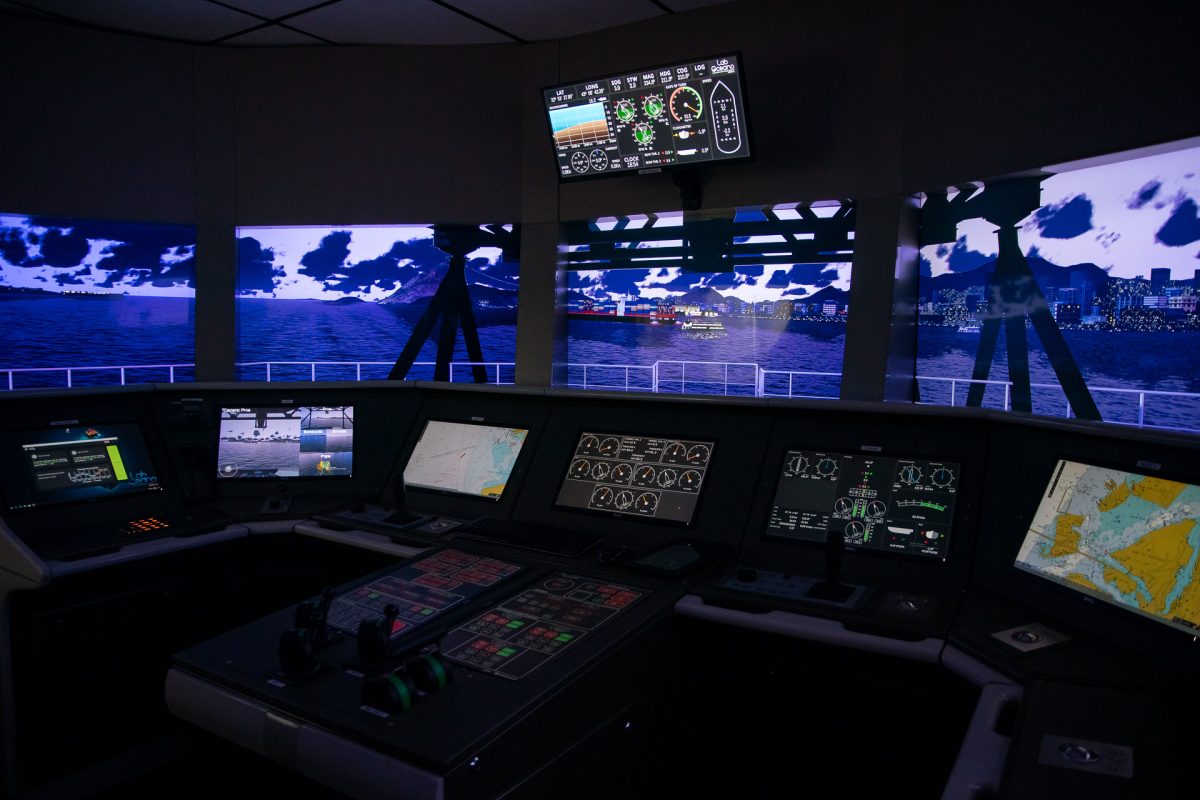 O laboratório também conta com um simulador de passadiço, construído com modelos matemáticos desenvolvidos em parceria com a Marinha do Brasil, que reproduz com alta precisão manobras complexas realizadas por embarcações em portos brasileiros, como os presentes na Baía de Guanabara. O equipamento é utilizado em treinamentos de comandantes e práticos, oferecendo uma experiência imersiva próxima da operação real. O simulador possibilita treinar situações de risco, como falhas de motor ou a atuação de correntes marítimas intensas. Tudo isso sem expor embarcações e tripulações ao estresse.