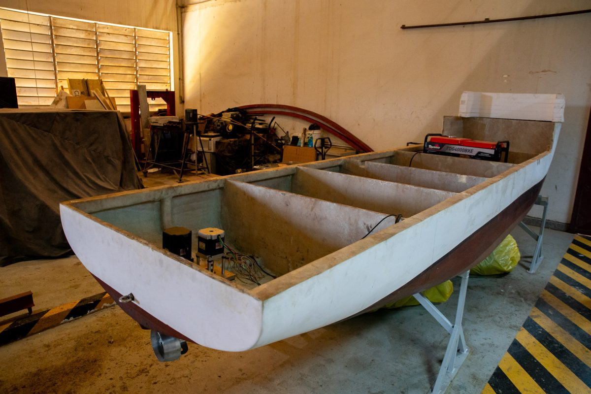 Os ensaios no laboratório vão desde protótipos — como cascos de embarcações equipados com sensores, motores e lemes — até modelos usados exclusivamente para estudar hidrodinâmica. “Na maioria das vezes, os testes são de casco. O modelo é vazio por dentro, a gente compensa peso e centro de gravidade com lastro e observa como ele se comporta”, detalha Luiz Felipe.